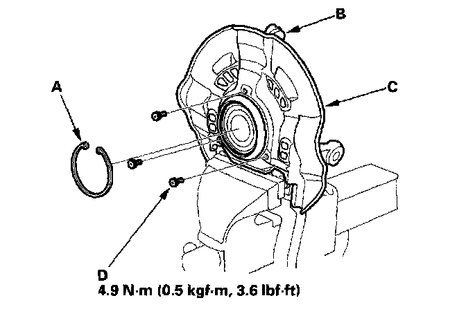 20. Remove the screws (A), snap ring (B), and the splash guard (C) from the knuckle (D).