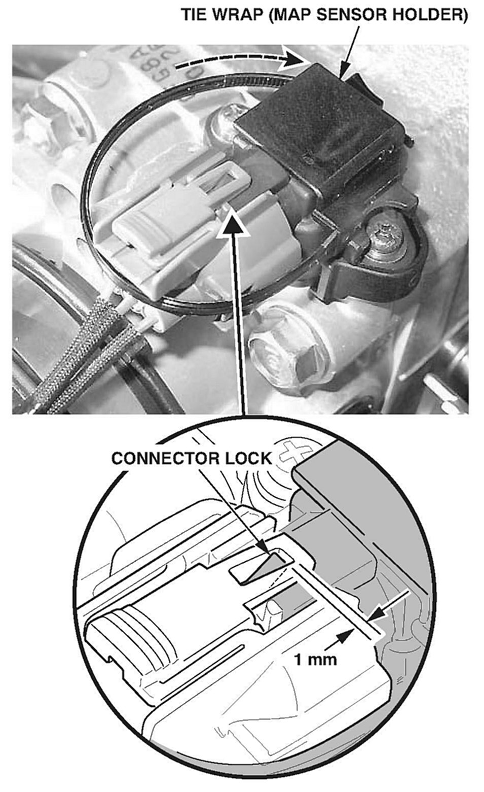3. Route the tie wrap between the connector lock and the wires, and tighten until the connector lock shows a 1 mm gap.