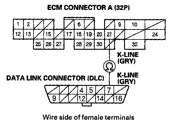 NO - Repair open in the wire between DLC terminal No. 7 and the ECM (A21). After repairing the wire, check the DTC with a scan tool/HDS and go to the indicated DTC's troubleshooting.