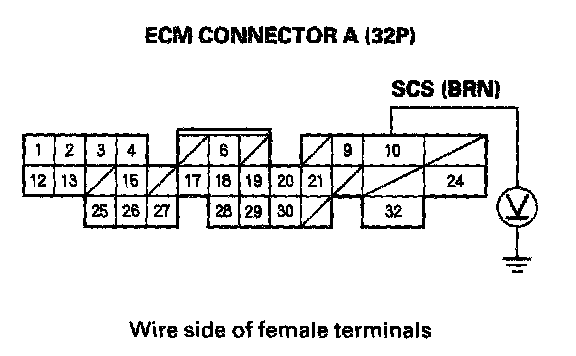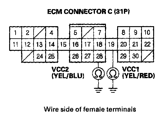 11. Check for continuity between body ground and ECM connector terminals C19and C28 individually.