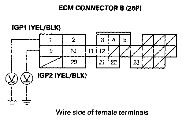 19. Measure voltage between body ground and ECM connector terminals B2, B10, B20, and B22 individually.