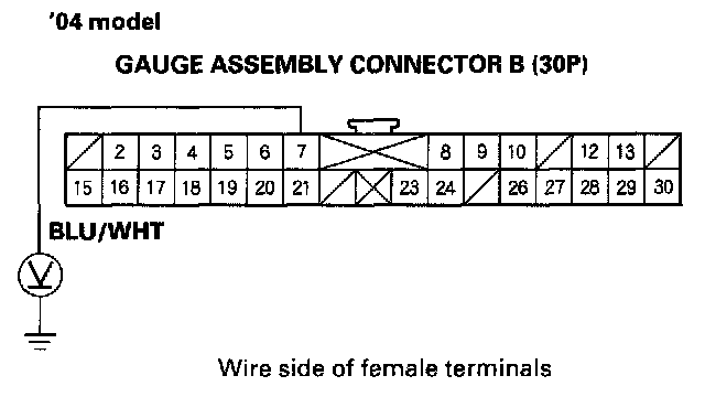 8. Measure voltage between the gauge assembly connector C (20P) No.3 terminal and body ground ('00-03 models) or between the gauge assembly connector B (30P) No.7 terminal and body ground ('04 model).
