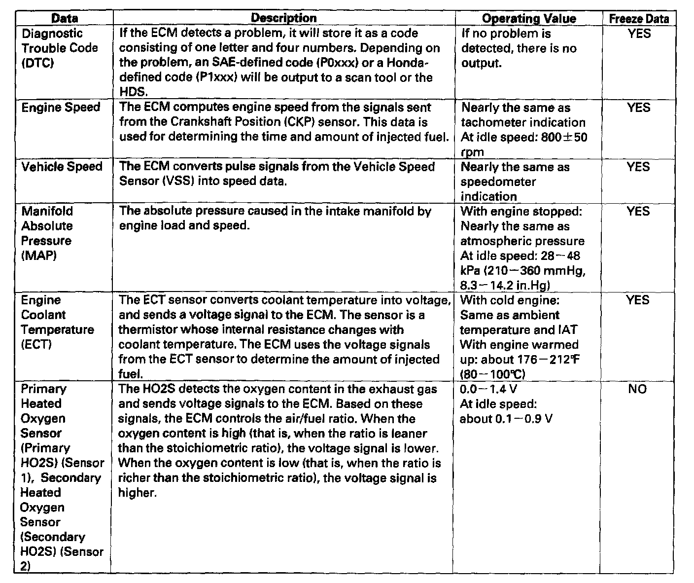 ECM DataYou can retrieve data from the ECM by connecting a scan tool or the HDS to the data link connector (DLC). The items listed in the table conform to SAE recommended practice. The HDS also reads data beyond that recommended by SAE to help you find the causes of intermittent problems.