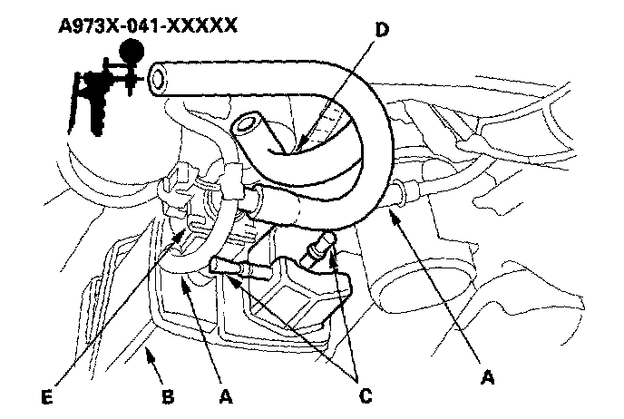 5. Disconnect the vacuum hose (D) from the EVAP canister vent shut valve (E), and connect a vacuum pump to the EVAP canister vent shut valve.