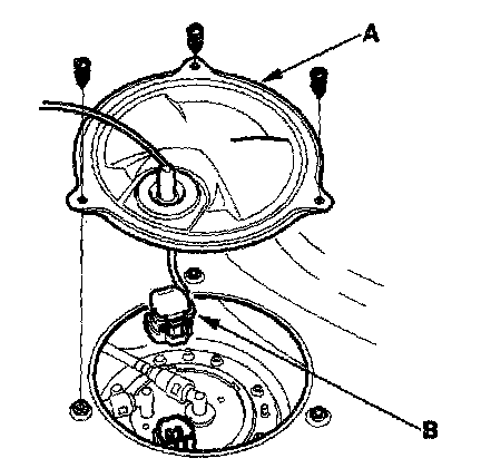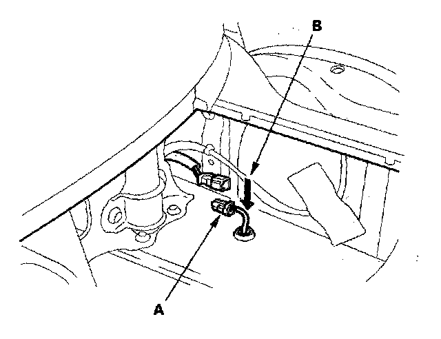 6. Remove the access panel (A) from the floor, and disconnect the fuel tank 5P connector (B).