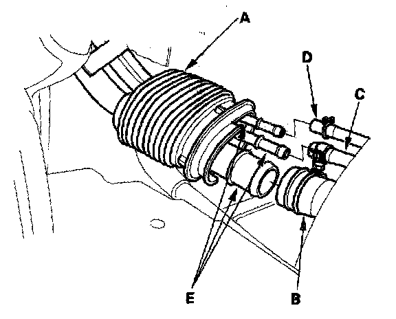 8. Remove the fuel pipe cover (A), and disconnect the fuel fill neck tube (B), the fuel tank vapor recirculation tube (C) and the fuel tank vapor signal tube (D) from the fuel fill pipes (E).