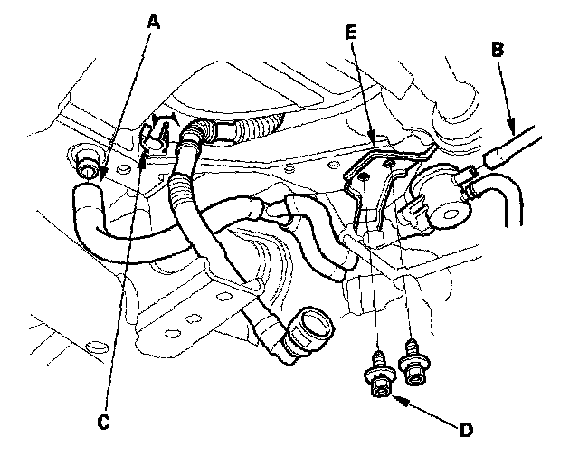 20. Disconnect the hose (A) and fuel vent tube (B), then remove the fuel tank vapor vent tube from the tube holder (C). Remove the bolts (D) and the fuel vent assembly (E).