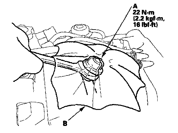 6. Place a rag or shop towel (B) over the fuel pulsation damper.