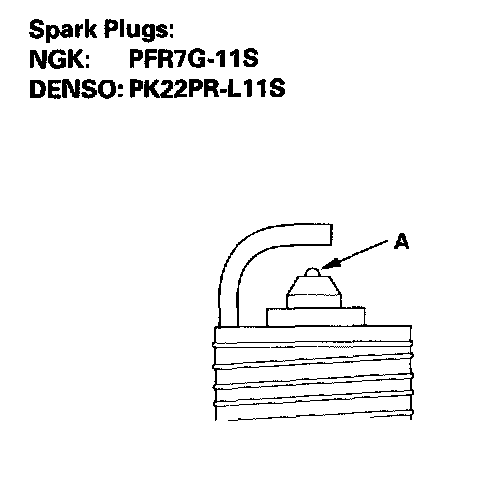 3. Replace the plug at the specified interval, or if the center electrode is rounded (A). Use only the spark plugs listed.