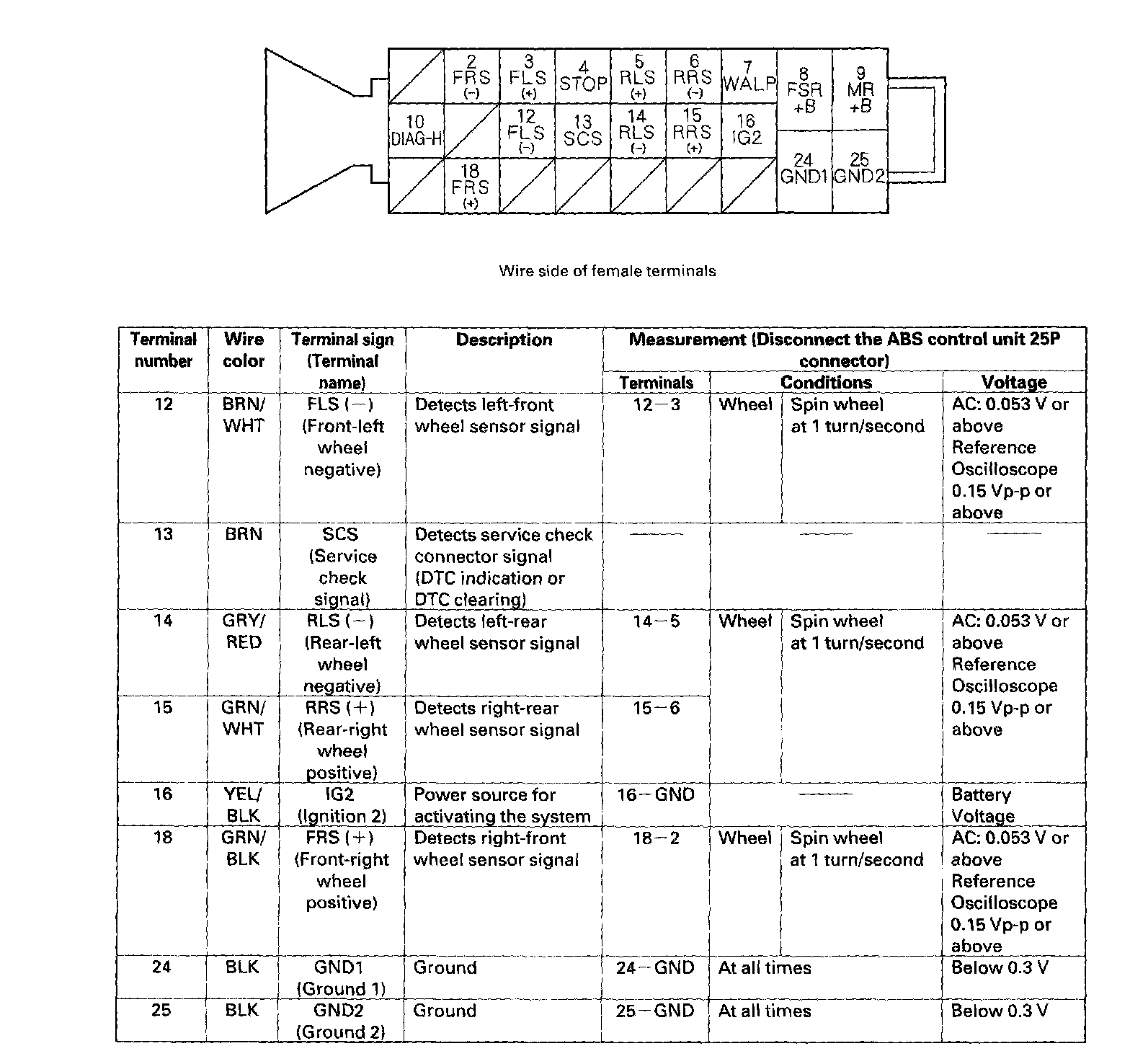 ABS Control Unit Inputs and Outputs for 25P Connector