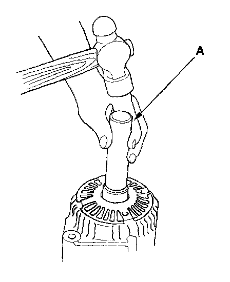 16. Support the stator housing in a vise, and drive out the front bearing with a brass drift (A) and hammer.
