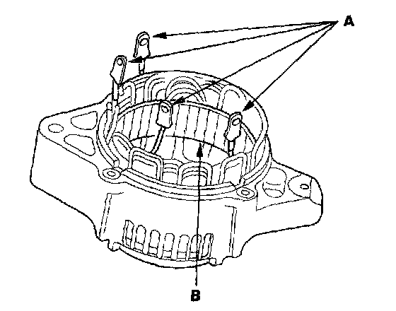 18. Check for continuity in each direction, between the B terminal and P terminals, and between the E terminal and P terminals of each diode pair. All diodes should have continuity in only one direction. Because the rectifier diodes are designed to allow current to pass in one direction, and the rectifier is made up of eight diodes (four pairs), you must test each diode in both directions for continuity with an ohmmeter that has diode checking capability: a total of 16 checks.
