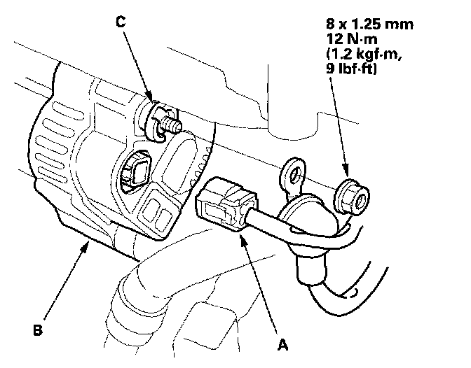 5. Disconnect the 4P connector (A) from the alternator (B), and disconnect the BLK wire from the alternator B terminal (C).