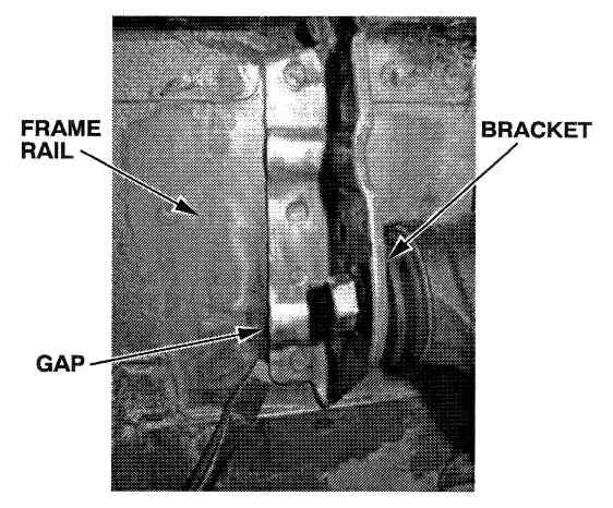 2. Straighten out the frame rail by placing a block of wood on the bracket spot welds and then striking the block firmly with a 48-ounce hammer.
