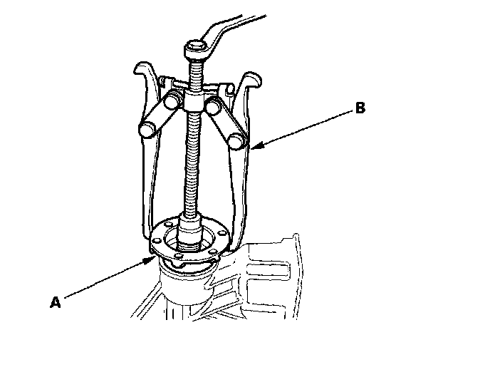 9. Remove the companion flange (A) using a commercially available bearing puller (B) as shown.