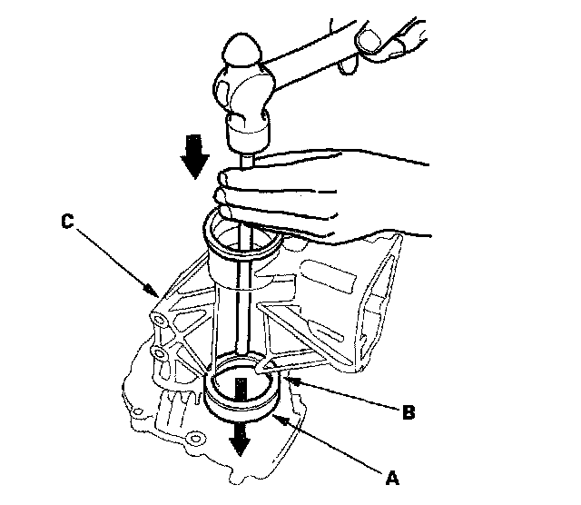 11. Remove the secondary shaft (A) from the rear cover (B) using a press (C) as shown.