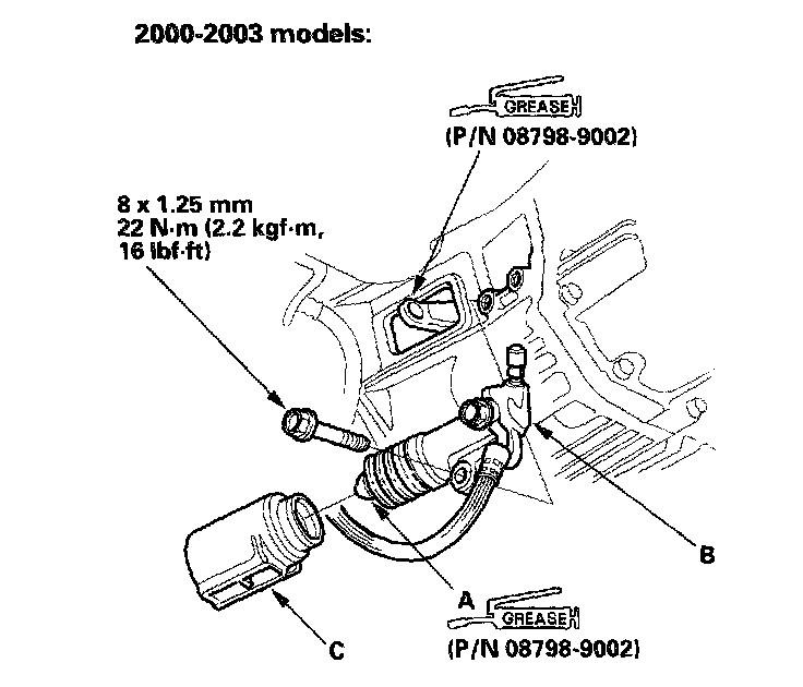 13. Apply super high urea grease (P/N 08798-9002) to the end of the slave cylinder push rod (A). Install the slave cylinder (B) and the release fork boot (C).