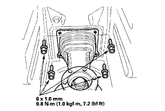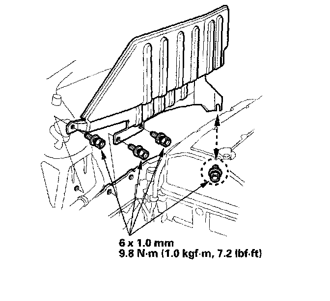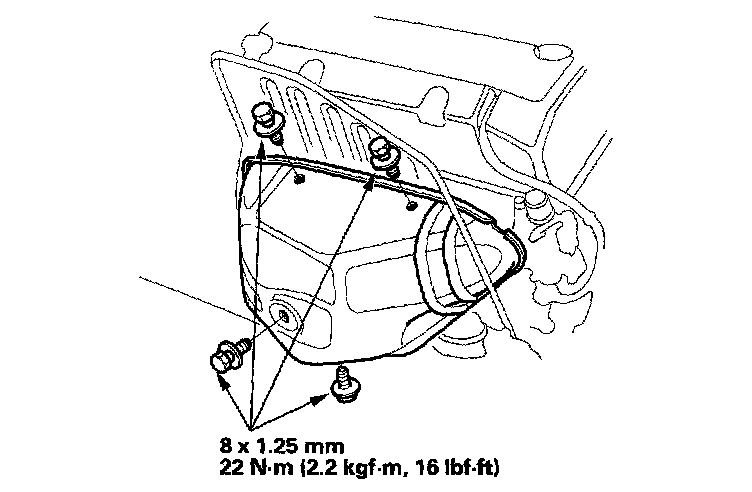 8. Raise the transmission, then install the three transmission rear mount bolts.