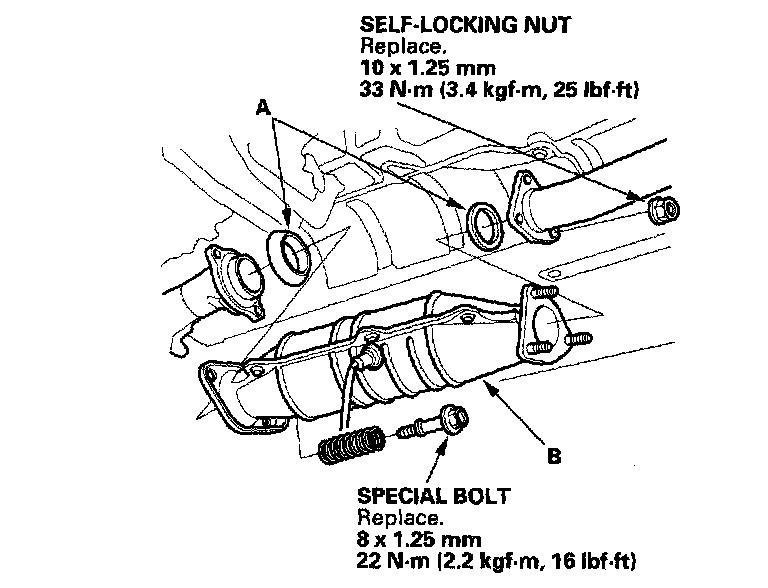 17. Install the gaskets (A) and Three Way Catalytic Converter (TWC) (B).