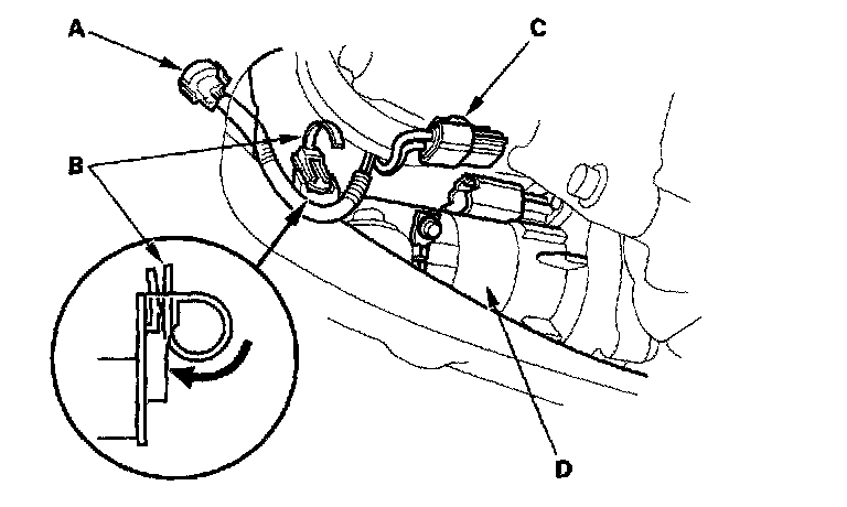 18. Install the wire harness (A) onto the transmission, then connect the Heated Oxygen Sensor (HO2S) (B), Secondary Heated Oxygen Sensor (Secondary HO2S) (C), and the back-up light switch (D) connectors.