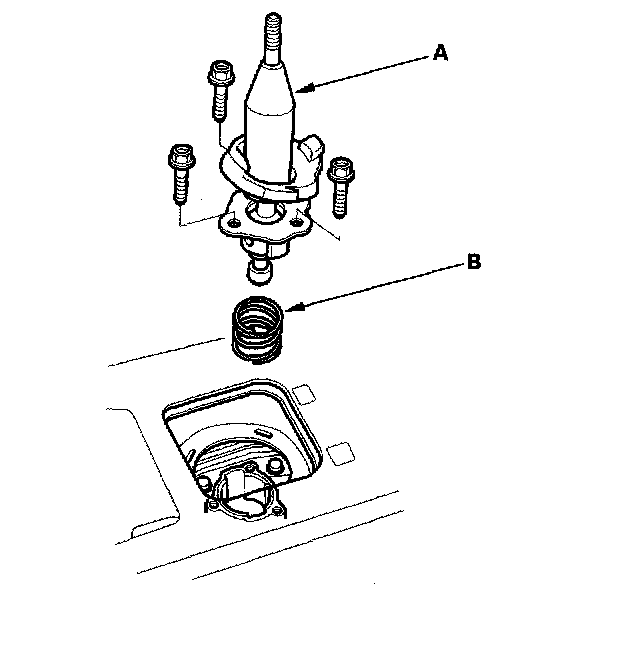 5. Remove the three bolts, then remove the shift lever (A) and the shift lever spring (B).