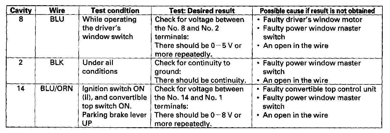 5. With the power window master switch still disconnected, make these input tests at the 14P connector.