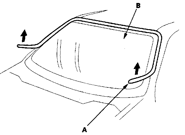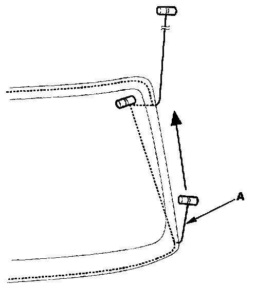 8. With a helper on the outside, pull the piano wire (A) back and forth in a sawing motion. Hold the piano wire as close to the windshield as possible to prevent damage to the body and dashboard. Carefully cut through the rubber dam and adhesive around the entire windshield.