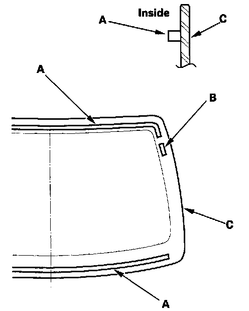 13. Attach rubber dams (A), fasteners (B), and other parts to the inside face of the glass (C). Be careful not to touch the glass where adhesive will be applied.