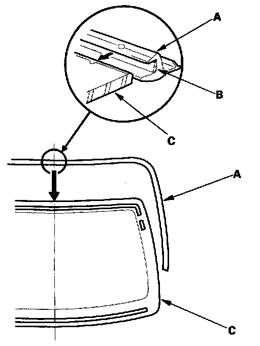 14. Attach the molding (A) with adhesive tape (B) to the edge of the glass (C). Be careful not to touch the glass where adhesive will be applied.