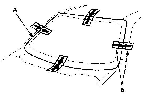 16. If new glass will be installed, set the glass (A) in the opening, and center it. Make alignment marks (B) across the glass and body with a grease pencil at the four points shown Be careful not to touch the glass where adhesive will be applied.
