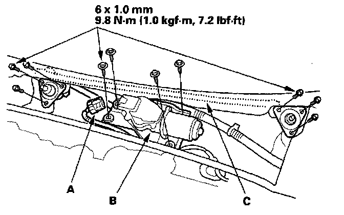 4. Remove the bolts, then remove windshield wiper linkage assembly (C).
