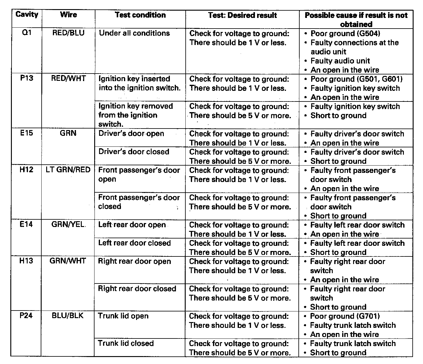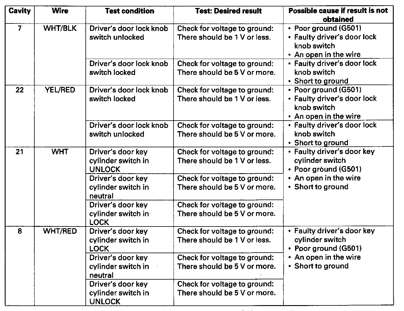 11. Reconnect the connector to the door multiplex control unit, and make these input tests at the connectors.