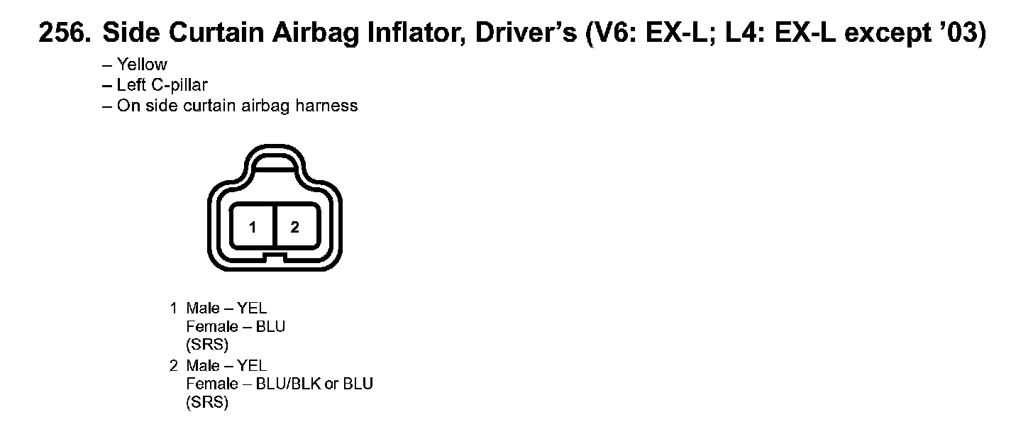 256. Side Curtain Airbag Inflator, Driver's (V6: EX-L; L4: EX-L Except '03):