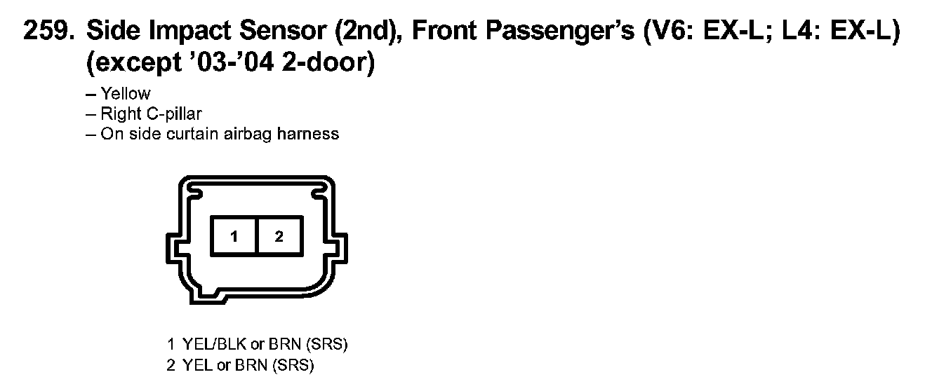 259. Side Impact Sensor (2nd), Front Passenger's (V6: EX-L; L4: EX-L) (except '03-'04 2-door):