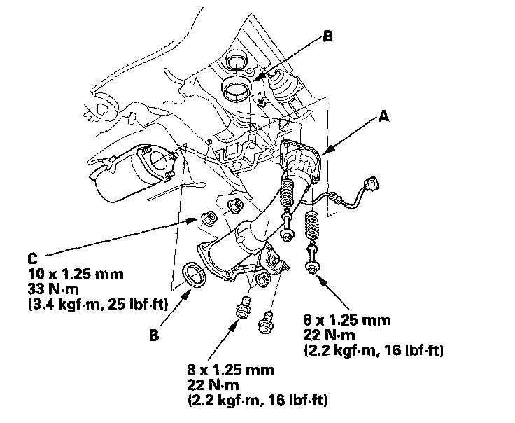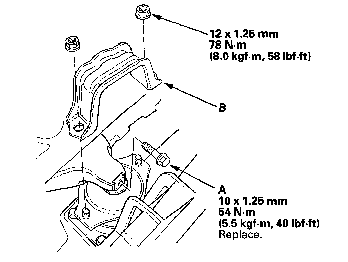 11. A/T model: Tighten the transmission upper mount bracket plate mounting bolts (A), then tighten the transmission upper mount bolt (B).