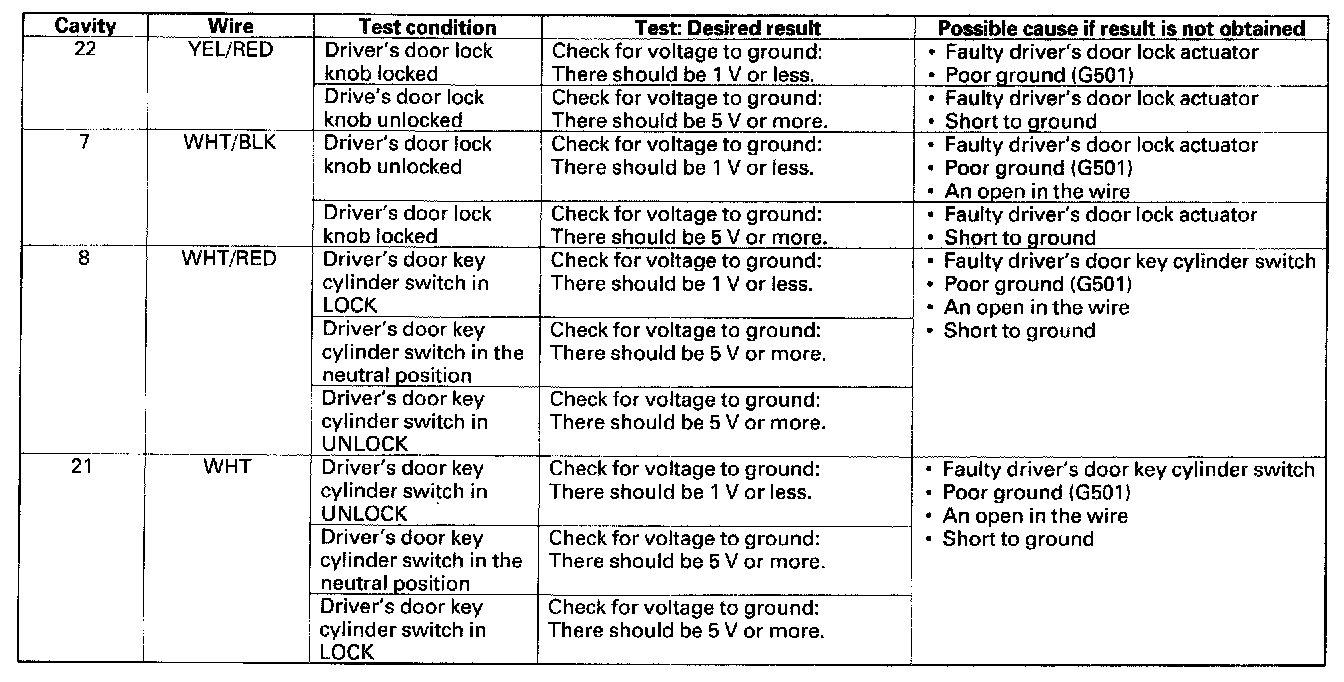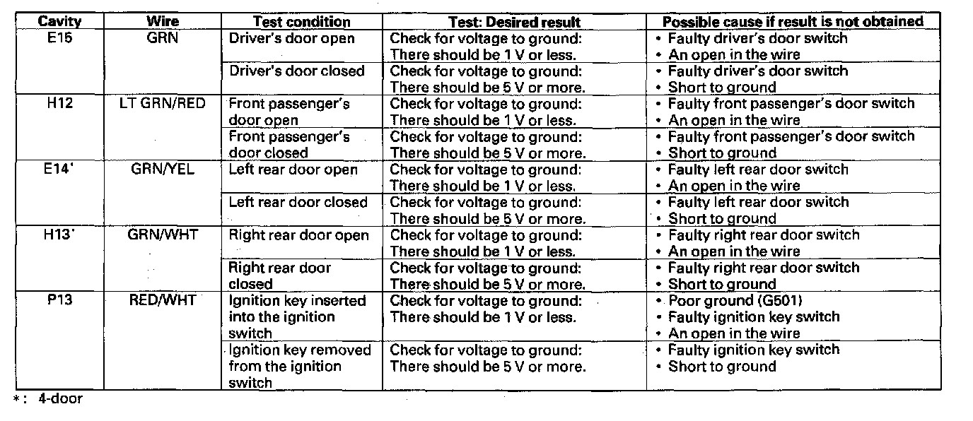 11. Reconnect the connector to the door multiplex control unit, and make these input tests at the appropriate connector.