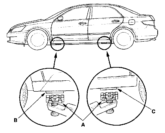 1. Position the hoist lift blocks (A), on safety stands, under the vehicle's front support points (B) and rear support points (C).