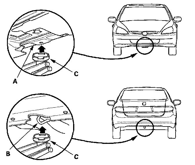 3. Position the floor jack under the front jacking bracket (A) or rear jacking bracket (B), center the jacking bracket in the jack lift platform (C), and jack up the vehicle high enough to fit the safety stands under it.