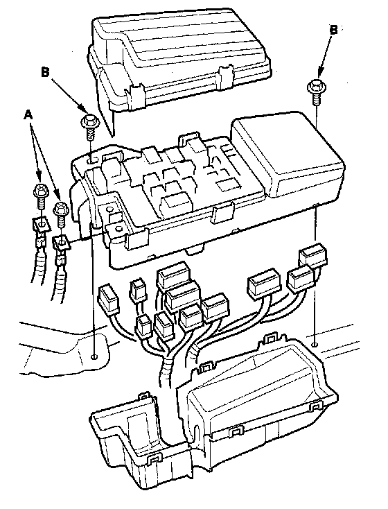 6. Remove the two mounting bolts (B) from the under-hood fuse/reley box.