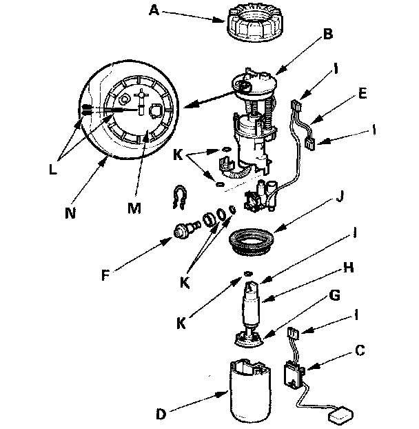 11. Install the parts in the reverse order of removal with a new base gasket (J), new locknut (A), and new O-rings (k). When installing the fuel tank unit, align the marks (L) on the unit (M) and the fuel tank (N).