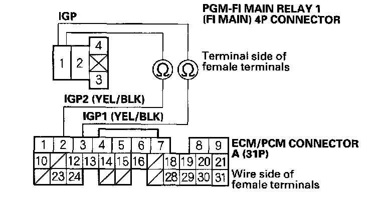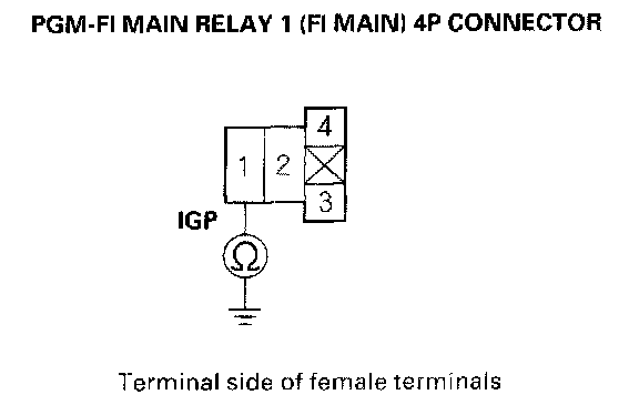 30. Check for continuity between PGM-FI main relay 1 (FI MAIN) 4P connector terminal No.1 and body ground.