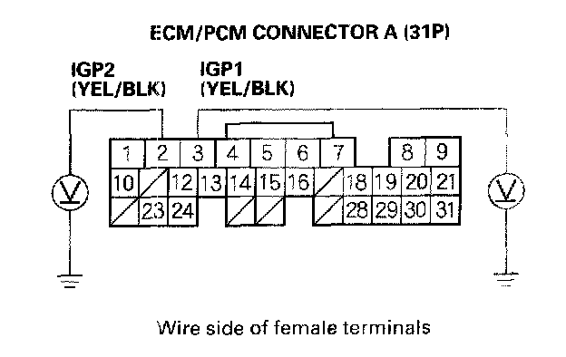 27. Check for continuity between body ground and PGM-FI main relay 1 (F1 MAIN) 4P connector terminals No.2 and No.3 individually.