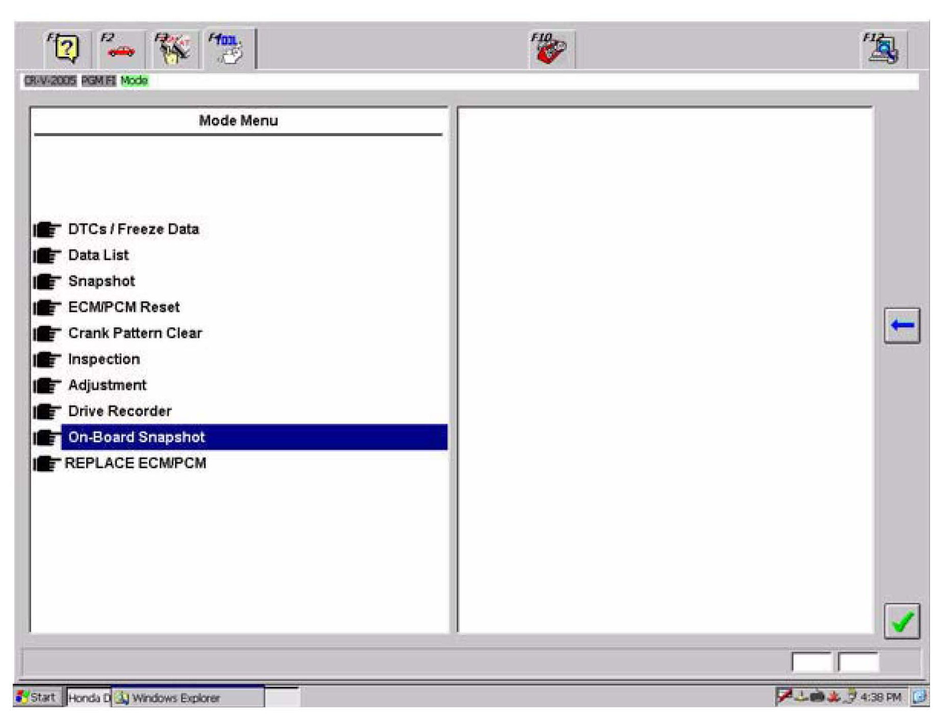 4. From the Mode Menu, select On-Board Snapshot. The HDS automatically downloads the data stored in the FCM/PCM and shows it on the display screen: