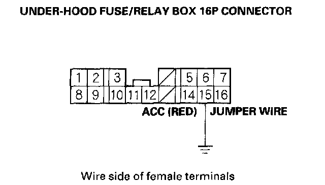 9. Momentarily connect under-hood fuse/relay box 16P connector terminal No.15 to body ground with a jumper wire several times.