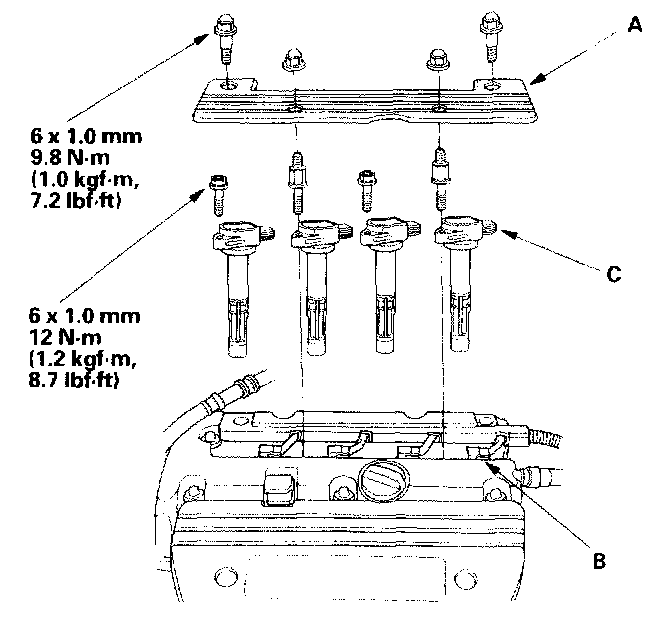 1. Remove the ignition coil cover (A), disconnect the ignition coil connectors (B), then remove the ignition coils (C).