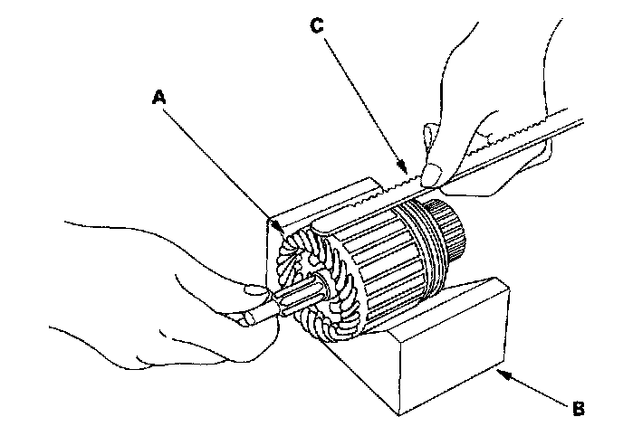12. Place the armature (A) on an armature tester (B). Hold a hacksaw blade (C) on the armature core. If the blade is attached to the core or vibrates while the core is turned, the armature is shorted. Replace the armature.