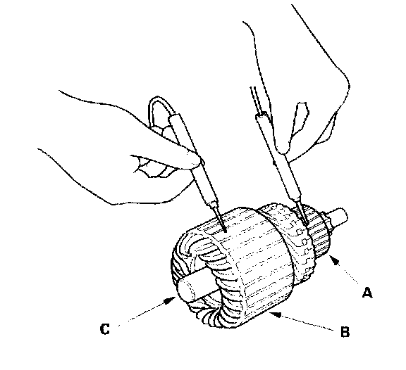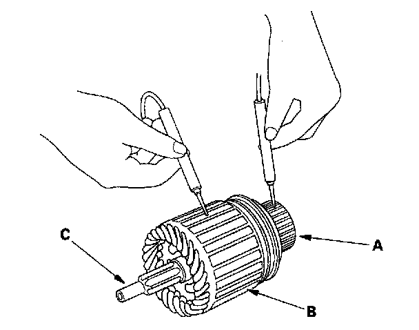13. Check with an ohmmeter that no continuity exists between the commutator (A) and armature coil core (B), and between the commutator and armature shaft (C). If continuity exists, replace the armature.