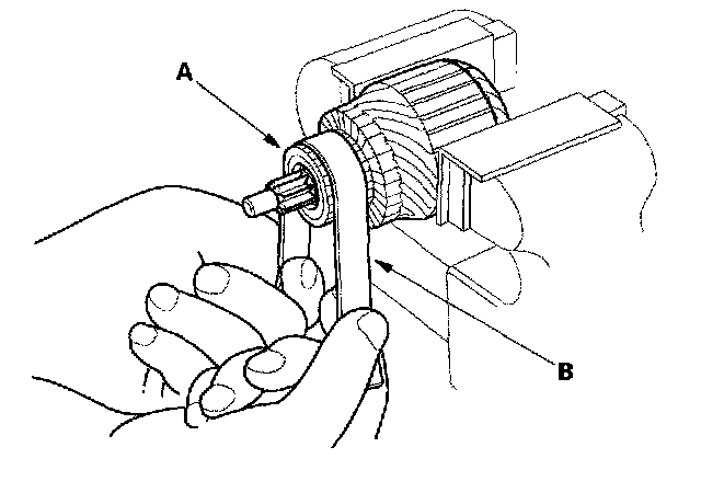 19. If the starter drive gear (B) is worn or damaged, replace the overrunning clutch assembly; the gear is not available separately. Check the condition of the flywheel ring gear to see, if the starter drive gear teeth are damaged.