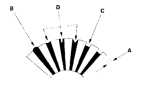 10. Check the mica depth (A). If the mica is too high (B), undercut the mica with a hacksaw blade to the proper depth. Cut away all the mica (C) between the commutator segments. The undercut should not be too shallow, too narrow, or V-shaped (D).