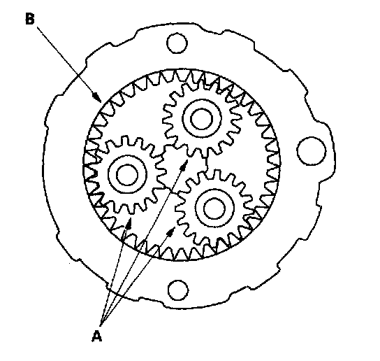 13. Check the planetary gears (A) and ring gear (B). Replace them if they are worn or damaged.